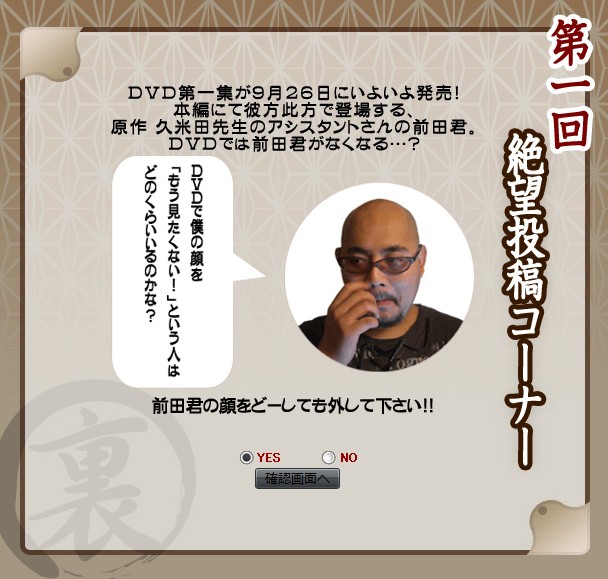 絶望先生公式 裏ページを開いて包帯をクリックするとアンケートが出てくる。